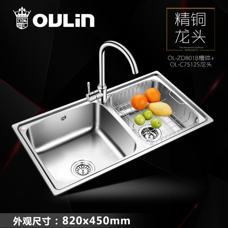 欧琳水槽 304不锈钢水槽双槽套餐801A/B 厨房洗菜池 洗碗盆 拉丝不锈钢双槽搭配欧琳精铜龙头