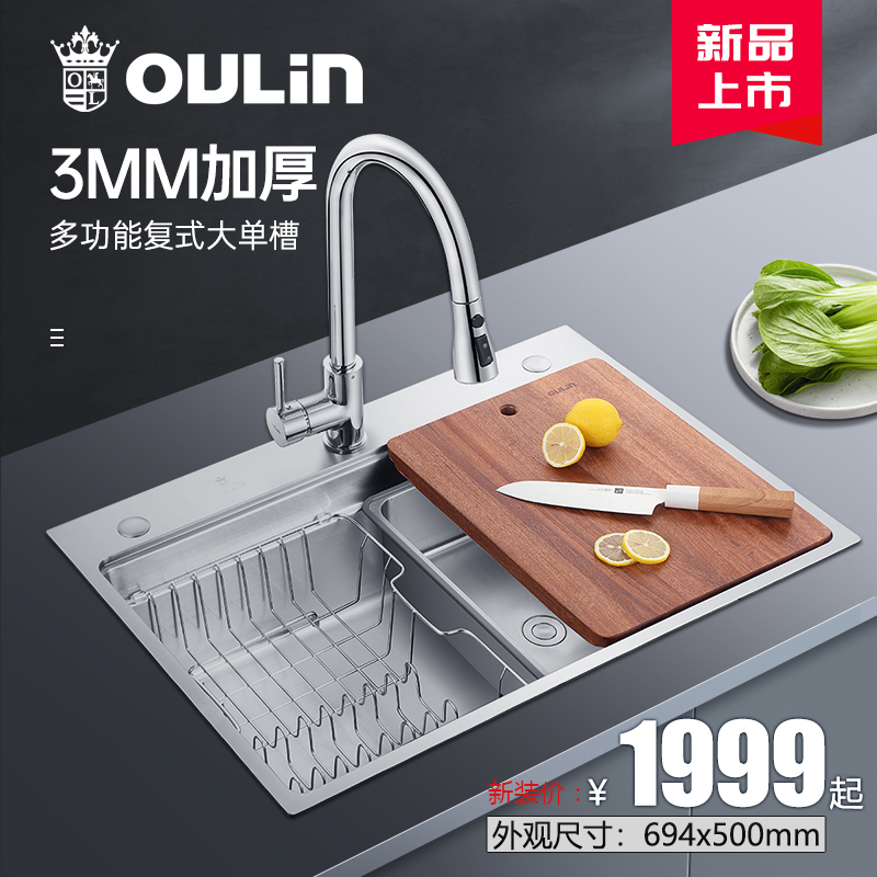 欧琳水槽大单槽9127 304不锈钢厨房洗菜盆单槽台上台下洗碗池家用9127