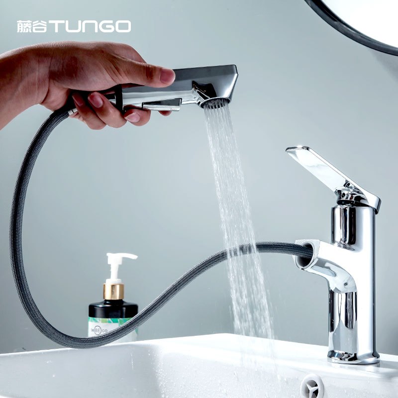藤谷 抽拉式面盆水龙头冷热洗脸盆龙头 卫生间台盆洗手盆双出水精铜龙头
