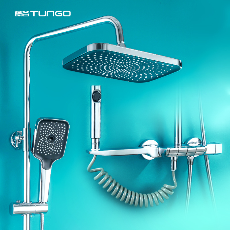 藤谷/TUNGO 卫浴钢琴灰色淋浴瀑布花洒套装四档沐浴器莲蓬头增压喷头淋雨器精铜龙头套装